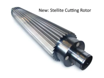 Tungsten carbide tipped rotor and stator knives for clean or inhouse recycling.