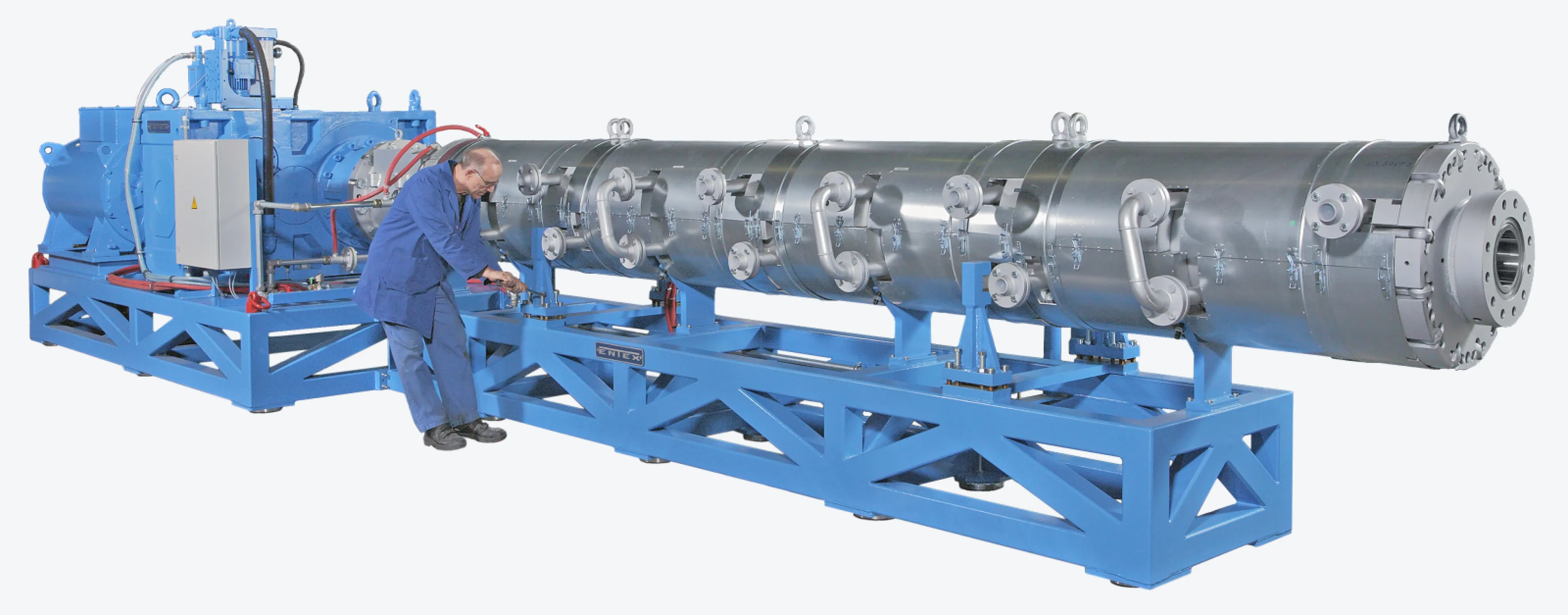 A further example for the strength of innovation was the commissioning of the world biggest Planetary Roller Extruder in the elastomer range in year 2010. This system with 4 modules and a drive capacity of 1.000 kW operates with an output capacity of approx. 6.000 kg/h.