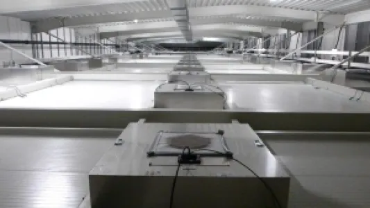 Large-scale cleanroom area for industrial series production with controlled particle concentration.